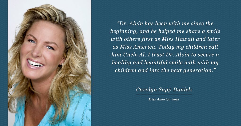 "Dr. Alvin has been with me since the beginning, and he helped me share a smile with others first as Miss Hawaii and later as Miss America. Today my children call him Uncle Al. I trust Dr. Alvin to secure a healthy and beautiful smile with with my children and into the next generation."